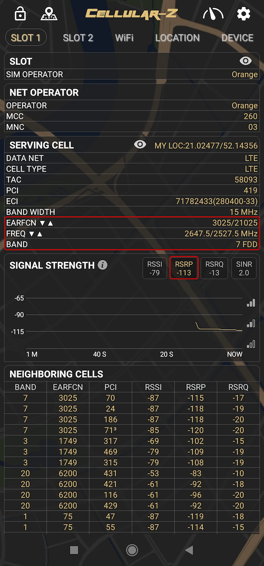 - Scroll down to find the E/U/ARFCN number which will indicate the frequency band.